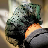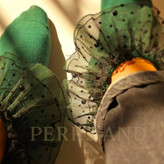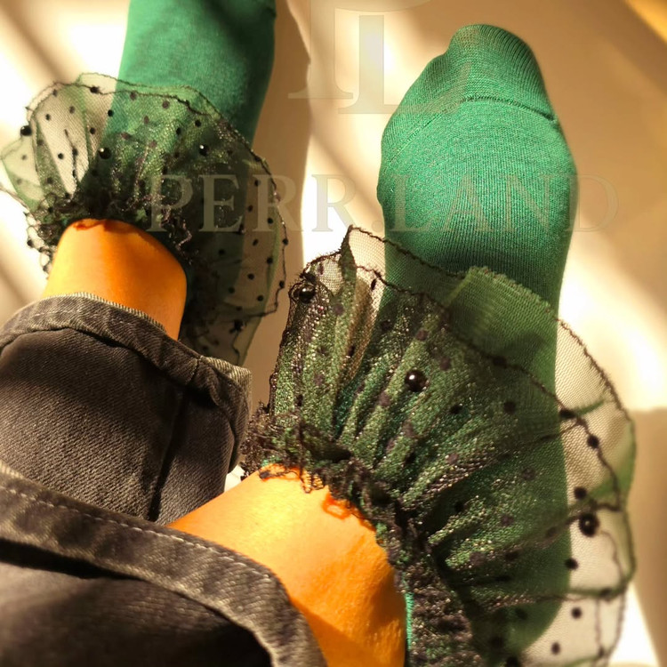 جوراب ساده نیم ساق و مچی سبز مخملی با تور مشکی خالدار و مروارید